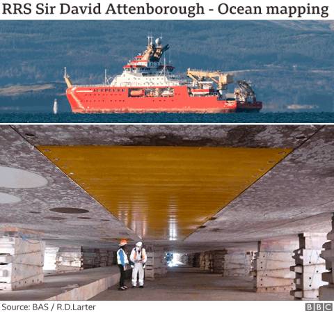 测绘图的大部分数据来自适合在冰洋中航行的加固船只,包括英国的科考船詹姆斯·克拉克·罗斯号,这些船都支持南极科学调查。(未来英国的贡献将由詹姆斯·克拉克·罗斯号的继承者大卫·阿滕伯勒爵士号科考船做出。)
