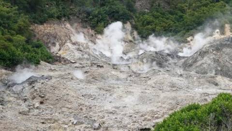 蒸汽从岩石裂缝中翻腾而出,岩石被染成病恹恹的黄绿色。浑浊的水中冒着一团团气泡,就像煮锅沸腾。空气中弥漫着刺鼻的硫磺恶臭。