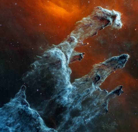 通常天文学家可能要把光过滤,让柱状星云显得更明晰,它们内部的新星的细节才能清晰可见。近红外相机产生的图像就是这样:它突出了那里成千上万颗年轻的蓝色恒星。