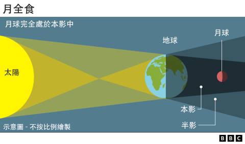 当整个月球进入地球本影内时,就会出现月全食。部分阳光会穿过地球大气层,过滤掉了大部分蓝光,只剩下红光,让月亮呈现铜红色,就是坊间所称的“血月”。由于地球直径比月球大四倍,其阴影也更宽,因此月食可持续一个多小时。
