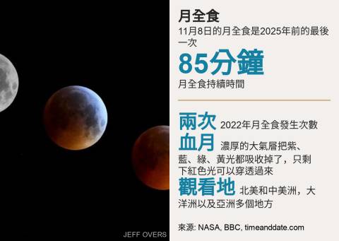 根据美国国家航空暨太空总署(NASA),这次月全食全长约一个半小时。