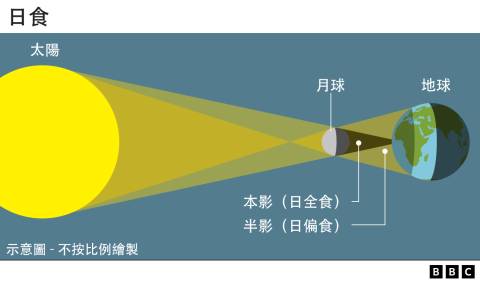 太阳比月球宽400倍,但离地球也是400倍远,当太阳丶月球和地球并列在一起,月球的阴影宽度就刚好可以遮挡整个太阳。发生日全食的地方会在几秒到几分钟内,天空变得像夜晚般黑暗。