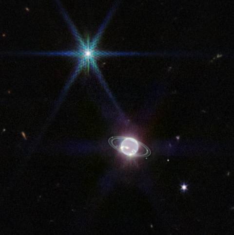 詹姆斯·韦伯望远镜不仅向宇宙深处探究,它还关注太阳系的星球。它拍到的最珍贵的照片就是太阳的第八颗行星海王星及其光环的图片。图中的小白点是海王星的月球,上图光芒照射的也是它的月球。那是海王星最大的天然卫星“海卫一”(Triton)。“海卫一”的光芒是詹姆斯·韦伯望远镜上反光系统上形成的。