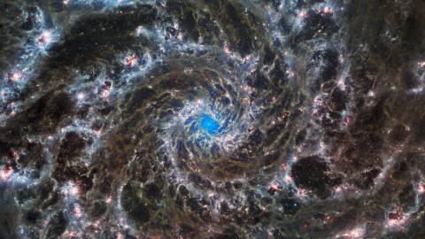 M74也被称作幻影星系,以其盘旋伸出怪异的臂膀而著名。它位于双鱼座(Pisces),距离地球约3,200万光年,正面对着地球,因此詹姆斯·韦伯望远镜能从一个完美的视角拍摄它的臂膀和结构。詹姆斯·韦伯望远镜的探测器特别善于捕捉宇宙气体和尘埃的蛛丝马迹。